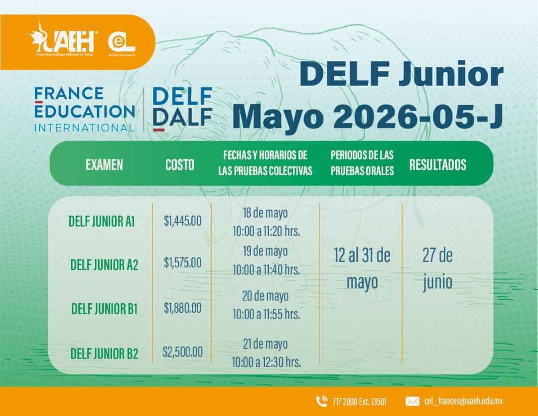 El Centro Certificador Pachuca Université Autonome, comparte información de la próxima convocatoria de la certificación internacional en lengua francesa DELF Junior - Sesión mayo 2026.