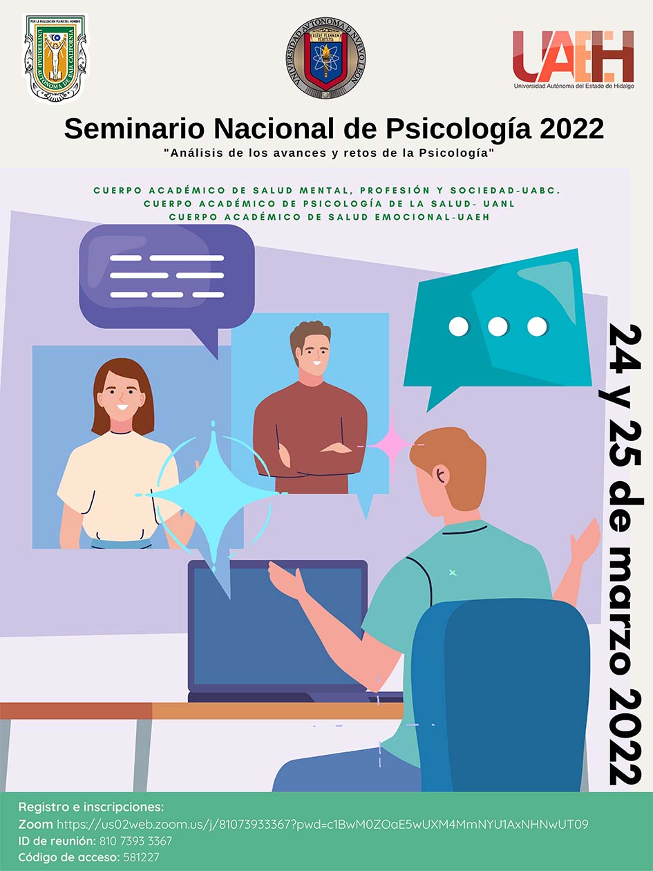 La Universidad Autónoma del Estado de Hidalgo, junto con las de Baja California y Nuevo León, llevarán a cabo el Seminario Nacional de Psicología “Análisis del presente y prospectivas para la tercera década del Siglo XXI”, el cual se llevará a cabo los días jueves 24 y viernes 25 de marzo de manera virtual, con un total de seis horas.