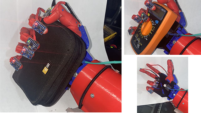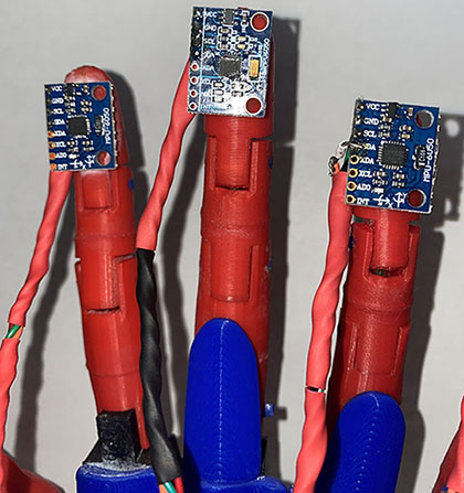 Para solucionarlo, incorporamos unidades de medición inercial sobre la punta de los dedos, a través de los cuales obtuvimos la inclinación de los mismos, lo que nos permitió inferir su posición para tener un mejor control de los movimientos. En la imagen 2 de este artículo, pueden observar las unidades inerciales colocadas sobre la punta de los dedos.
