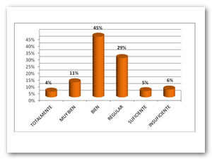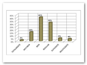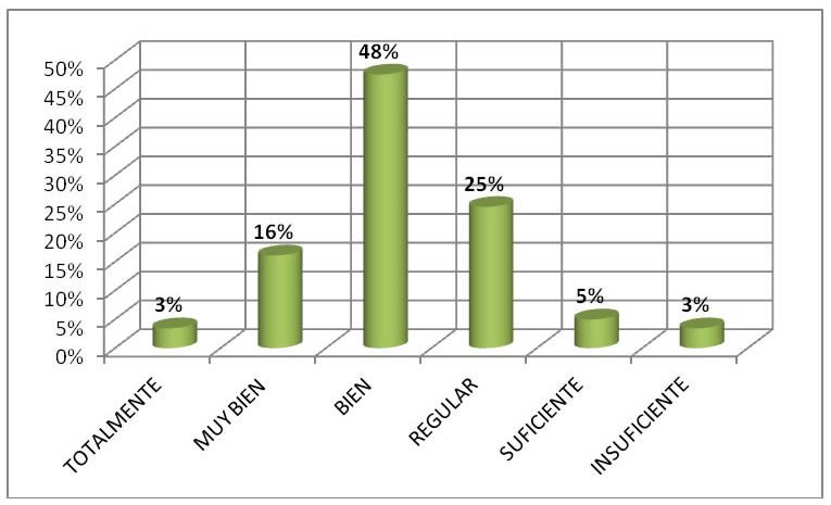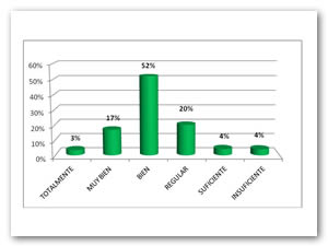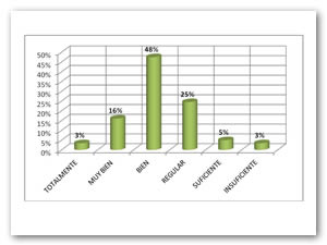 El 67% de los estudiantes encuestados tienen la percepción (bien a totalmente) de que los contenidos programáticos de sus materias aportan los conocimientos necesarios para el ejercicio de su profesión, un 30% consideran esta situación de suficiente a regular y el resto (3%) considera no aportarle.