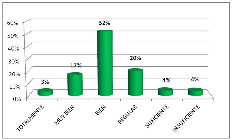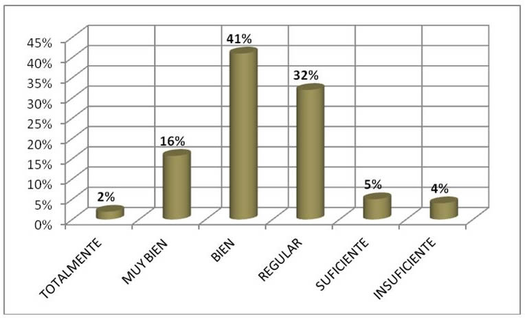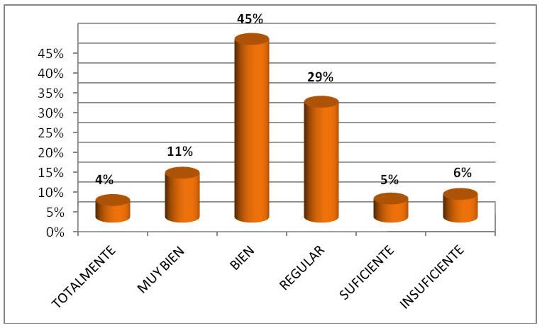Por cuanto a la pregunta: los conocimientos adquiridos te permiten resolver problemas propios de tu profesión mostrada en la figura, el 60% de los encuestados consideran que los conocimientos adquiridos le permiten resolver los problemas propios de su profesión, el 34% de suficiente a regular y al resto (6%) no lo podrá realizar.