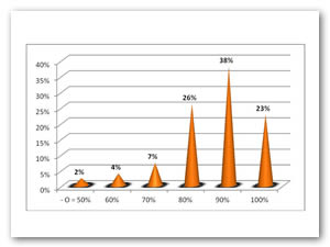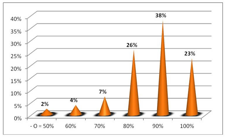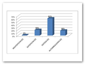 Por lo que refiere a valores institucionales, el 87% de los estudiantes señala que estos repercutirán significativamente en su vida personal y profesional, el 11% entre un 60 y 70% y el resto (2%) sin repercusión.