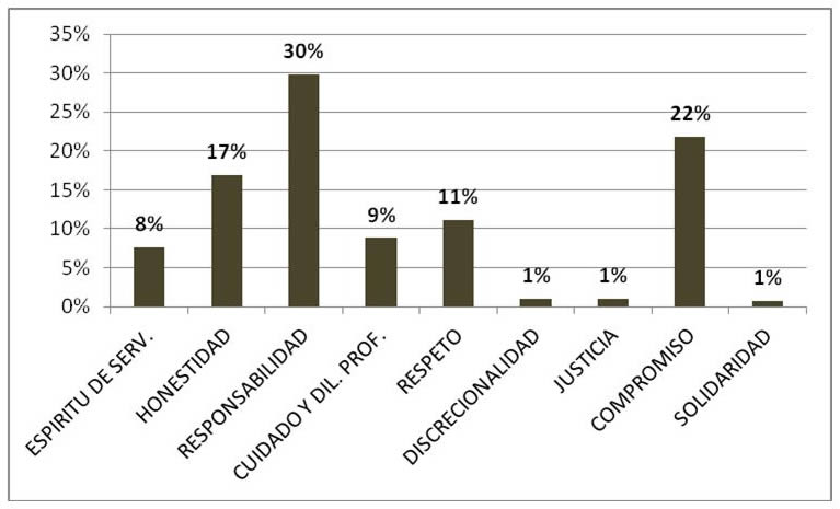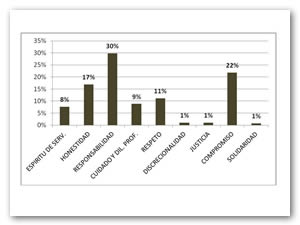 Según la figura los valores que tendrán mayor trascendencia en el ejercicio de su profesión, en orden de importancia son: la responsabilidad, el compromiso, la honestidad, el respeto, el cuidado y diligencia profesional, el espíritu de servicios.