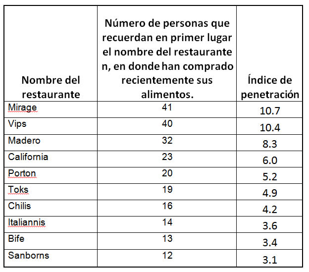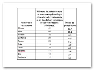 En la tabla anterior se observa que el restaurante cuyo mayor índice de penetración en el mercado de Pachuca es el Mirage, pues refleja un posicionamiento alto en la mente de los consumidores encuestados, ya que 41 personas lo mencionaron como el primer restaurante que recuerdan y supera en este índice a cualquier otro restaurante de la zona, incluyendo a las grandes cadenas y franquicias ubicadas en la zona.