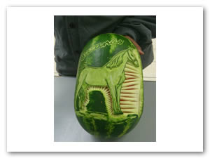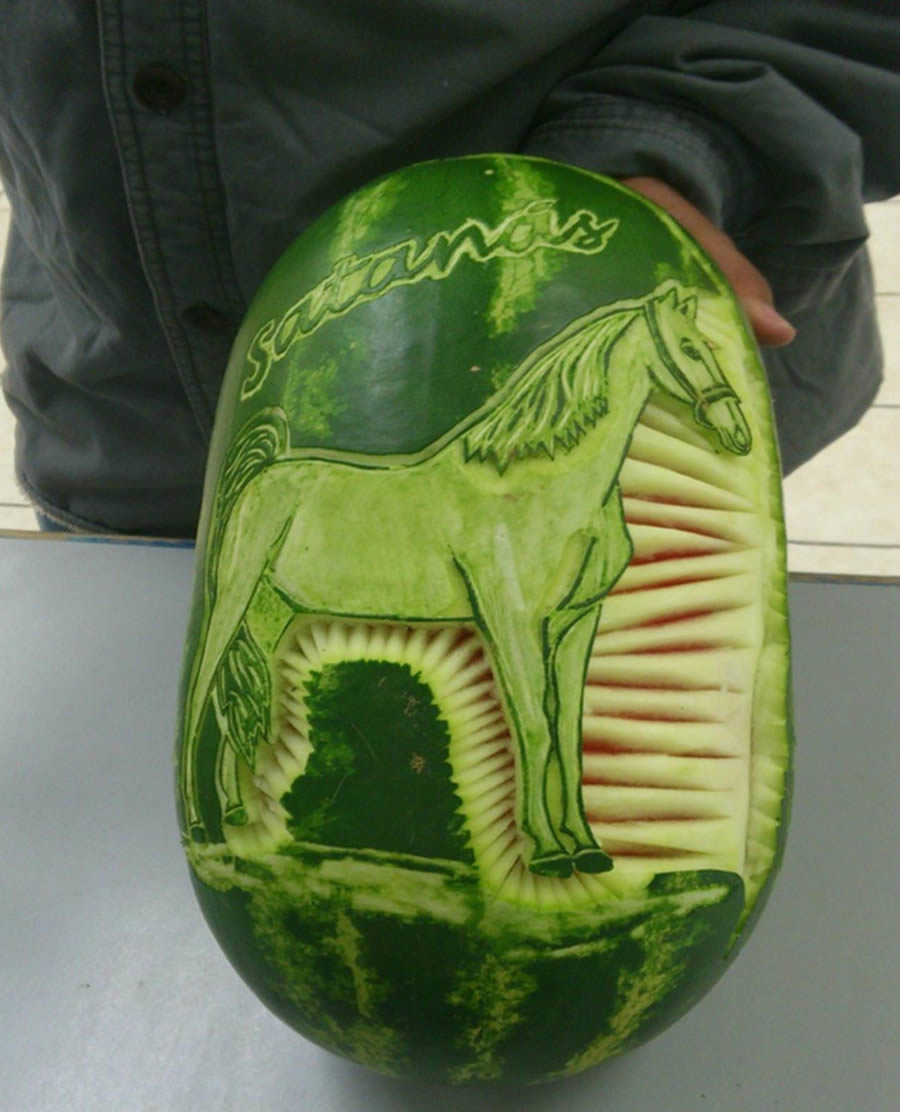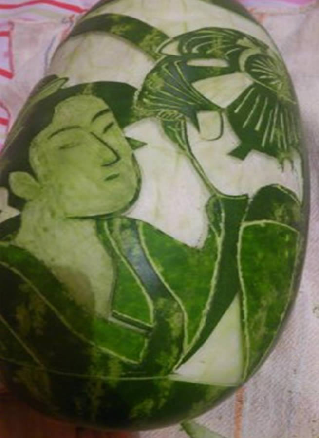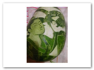This work type is usually elaborated with watermelons due to the color variety that this fruit toasts; commonly the one tempers you he/she adheres to the fruit (on the shell) and each line of the image is copied making marks with the tip of the knife. It is necessary to mention that the skin of the watermelon can acquire different tonalities of green, of that that he/she goes of the intense green from the skin to one very clear, almost white, achieving this way more color tones.
